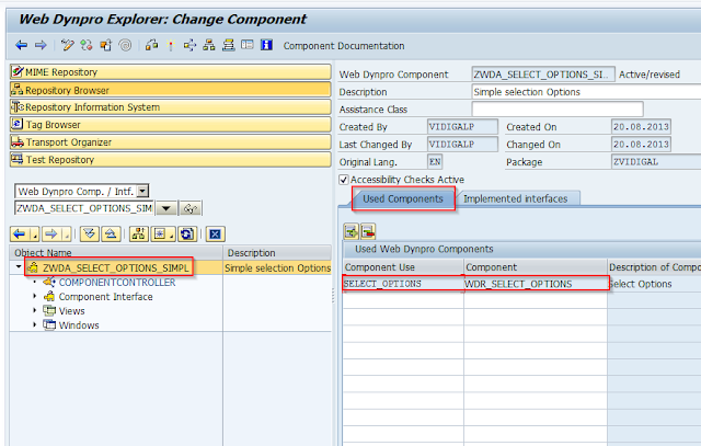 Then go to the Compoment properties and add the WDR_SELECT_OPTIONS reusable component to the used webdynpro components.